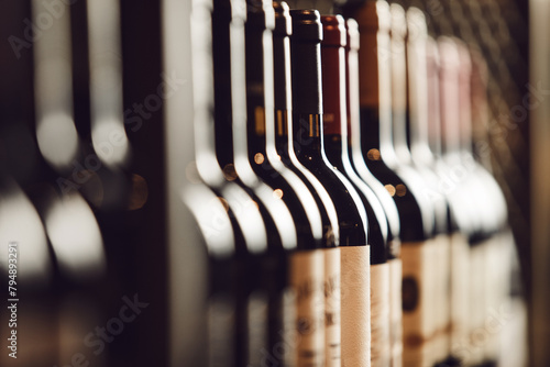 Close-Up View of Wine Bottles Lined Up on Cellar Shelf Highlighting Elite Alcohol Choices
