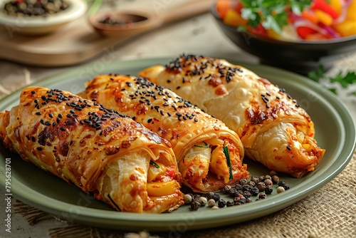 A green plastic tray with five chicken pastries, each filled and shaped like an Indian sweet roll or samosa