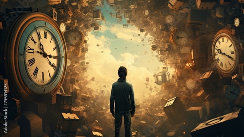 Man facing an explosion of clocks amidst clouds - A man stands before a deluge of clocks flying in a cloudy sky, illustrating concepts of time and existence