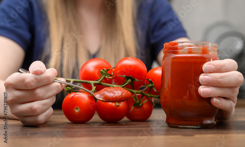Domowy keczup zrobiony z pięknych dojrzałych czerwonych pomidorów, sos pomidorowy, przecier