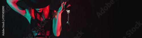 sexy woman dominant mistress girl holding a handcuffs in female hands. BDSM sex with submission and domination. A wide banner with a black background