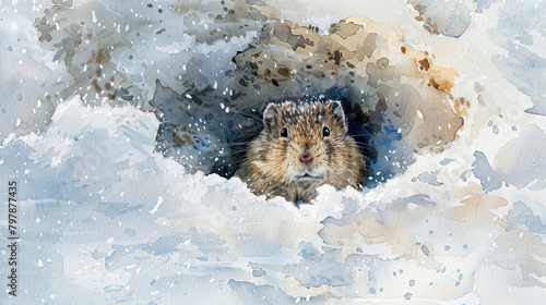 A watercolor painting of a lemming peeking out of its burrow in the snow.