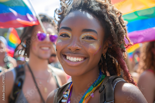 #970056890LGBT pride portrait of young woman at a pride march LGBTQ diversity and community concept.