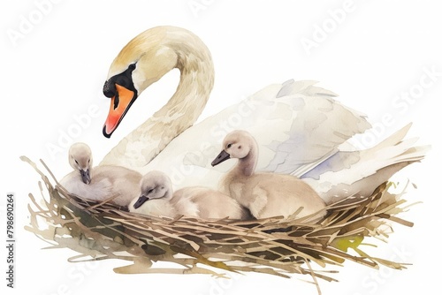 Serene swan nest with cygnets nestled in, soft feathers and gentle forms, detailed and nurturing, isolated on white background, watercolor