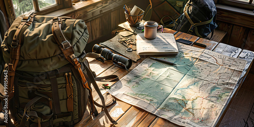 Close-up of a wilderness guide's desk with trail maps and survival gear, showcasing a job in outdoor adventure