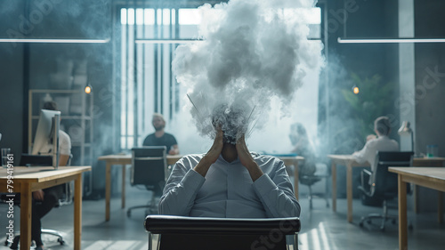 In an office setting, a person holds their head in frustration amidst a foggy atmosphere, symbolizing the struggle of navigating through cognitive fog brought on by overwork
