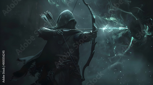 A fantasy ranger, cloaked in shadows, drawing a bow with magical arrows that glow with ethereal light. Epic shot.