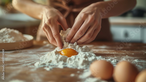 Mãos detalhadas fazendo uma massa com farinha e ovos sobre uma mesa de madeira