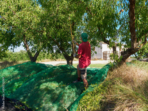 Man harvesting almonds in a net during the harvest season in Catalonia, Spain.