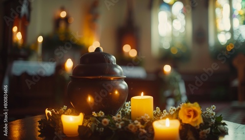 Church table with burning candles and a funerary urn symbolize funeral cremation and mourning
