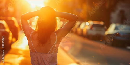 Exhausted person suffering from heat wave on a city street under direct sunlight, mirages blurring the urban horizon.