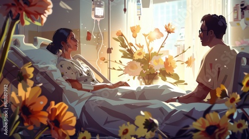 Digital illustration of a woman in a hospital bed with a man sitting beside her, vibrant flowers