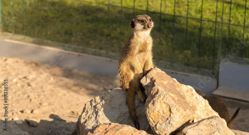 Surykatka stojąca (siedząca) na straży na skalistym wzgórzu. Strzeże granic obszarów należących do stada (klanu). Zwierzęta społeczne zamieszkujące obszary piaszczyste i skaliste.