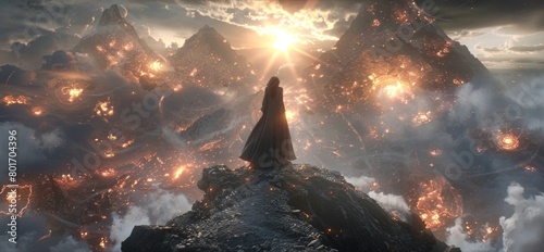 A lone sorceress stands atop a crumbling mountain facing off against an army of elemental beings using her magic to hold back impending . .