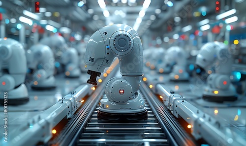 Hannover, Germany, Marcin Teluskis style, white robotic arms on a conveyor belt in a modern factory with blue lighting, photorealistic