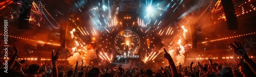 Fireworks are lit up in a large concert hall with people. Music party background. Banner
