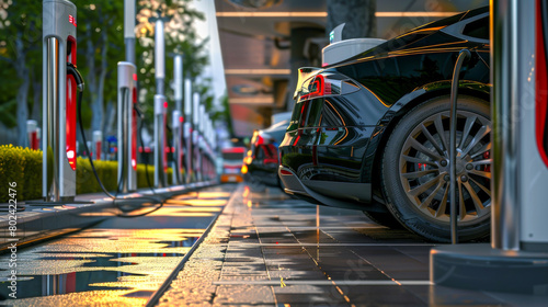 A black car is parked at a charging station