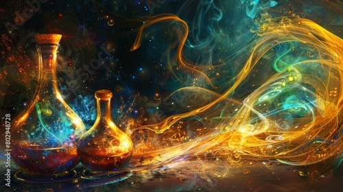 Artistic representation of the alchemical gold transformation process, highlighting vibrant flasks and swirling vapors around the emerging gold, capturing the magical and mysterious essence of alchemy