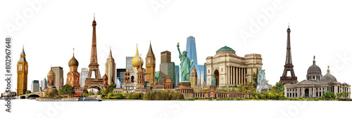 Historical monuments of different countries isolated on transparent background, travel and tourism concept