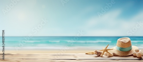 A copy space image featuring various beach accessories on a pastel wooden board placed on the sandy beach during summer