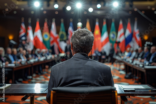 Rear perspective of a male statesperson passionately promoting diplomacy and cooperation to global dignitaries, amidst world leaders and diplomats
