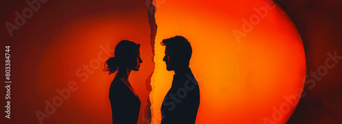 Troubled Love: Silhouettes of a couple in marital turmoil, facing opposite ways, teetering on the edge of divorce or separation