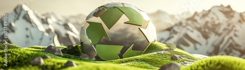 A beautiful landscape with a large green and silver recycle symbol in the foreground