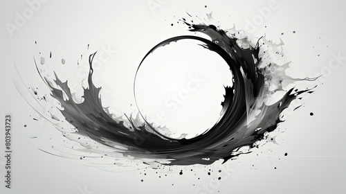 Black Color Oil Paint Spilling Over on Canvas in Chinese Style Circular Traces Thick Line White Background