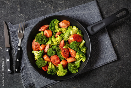 fried juicy sausage and crispy broccoli in skillet