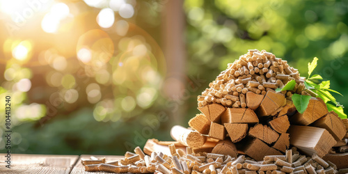 Pile of biomass wood pellets and a log of wood set against a softly blurred greenery background