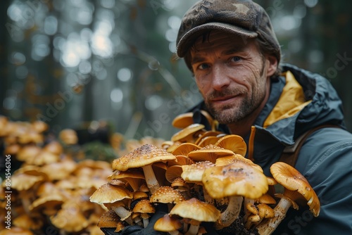 A man in outdoor gear cradling a large cluster of wild mushrooms in the forest with a subtle smile