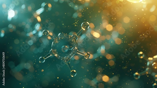 Create a 3D rendering of a rotating benzene ring with a glowing neon green outline against a dark blue background.