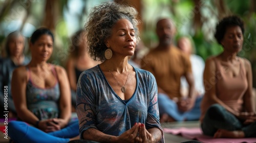 Group of women meditating together for psychological and physical therapy Including yoga and balance and flexibility in the mind. body and spirit