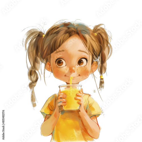 Mała dziewczynka trzyma w ręce szklankę z sokiem pomarańczowym i pije z niej, w tle widoczne są elementy wystroju wnętrza
