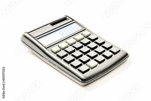A classic pocket calculator with a black case and silver buttons, displaying a random number, resting on a white background.