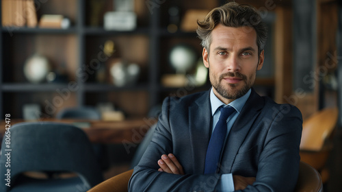 Portrait of handsome young businessman with arms crossed in modern office.