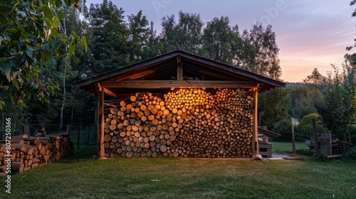 Stacks of Firewood in the Garden Woodshed for Fireplace and Stove