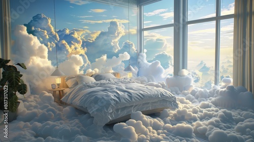 Heavenly bedroom setup with a comfortable bed surrounded by fluffy clouds, offering a peaceful retreat for ultimate relaxation at bedtime