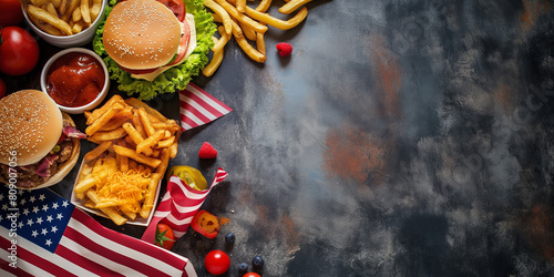 American food restaurant background. Cheeseburger, french fries, tomatoes and ketchup. Fast food bar with typical USA meals.