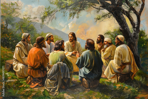 #641321493Group meditating outdoors beside a river in a peaceful, lush forest setting with distant hills under a clear sky.