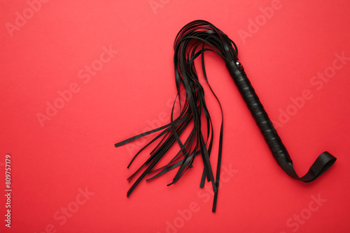 Leather bdsm whip on red background. Erotic toys for BDSM