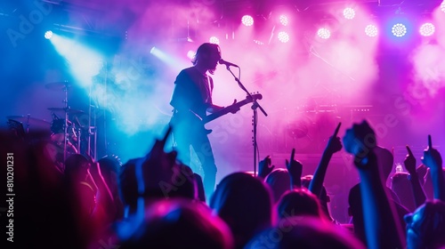 frontman of band playing on a guitar on a stage in front of a cheering crowd, with purple and blue neon lights, strobo, dust, vibrant, high energy