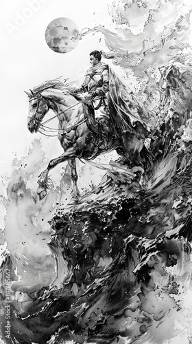 Majestic ink image of a warrior on horse amidst dynamic waves