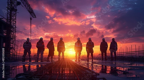 Silhouettes of construction workers with hard hats at a building site during a vivid sunset, symbolizing development and teamwork.