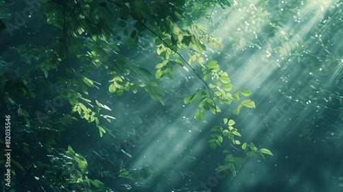 Promienie słoneczne przenikające przez gęste zielone liście drzewa, tworząc jasne plamy na ziemi