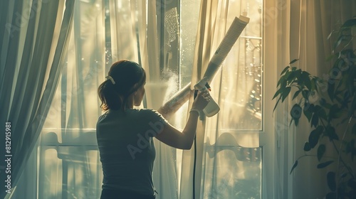 Woman manually washes the window of the house with a rag with spray cleaner and mop inside the interior with white curtains Restoring order and cleanliness in the spring cleaning servi : Generative AI