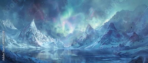 An artistic representation of the epic landscape of a winter wonderland, with the Aurora Borealis casting an enchanting light over the mountains and lake