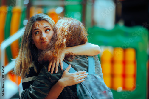 Woman Hugs Fake Friend Making Faces Behind her Back. Backstabbing toxic girlfriend embracing someone with bad intentions