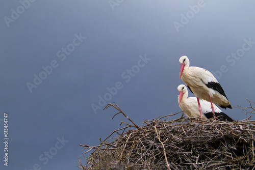 Two white storks perched on their nest incubating the egg of their future chick.