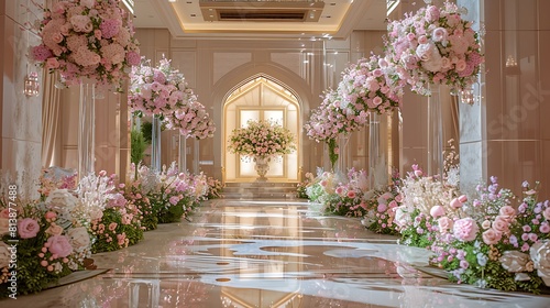 Gorgeous chapel for wedding celebration, many pretty flowers, beautiful decorations for wedding, copy space,space for text,Generous AI,結婚式のお祝いのための豪華なチャペル、多くの綺麗な花々、結婚式の美しい装飾、コピースペース,テキスト用スペース